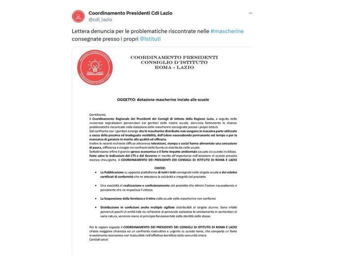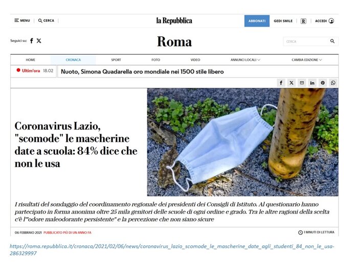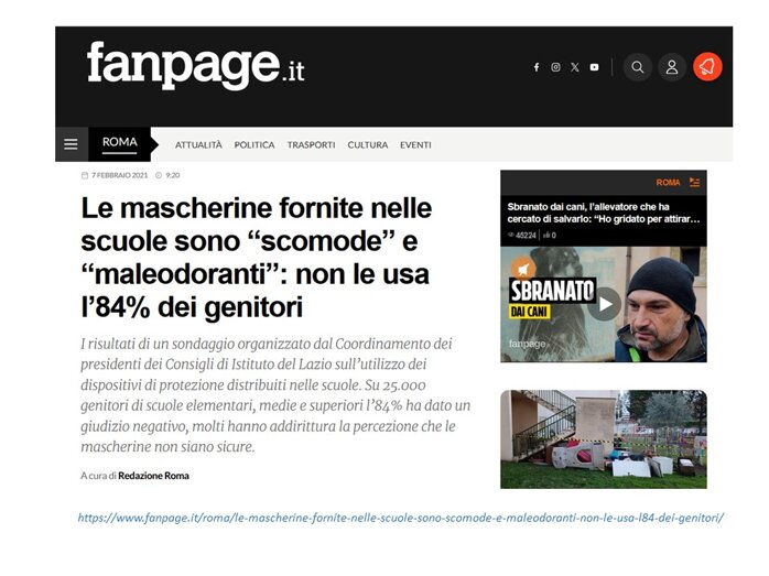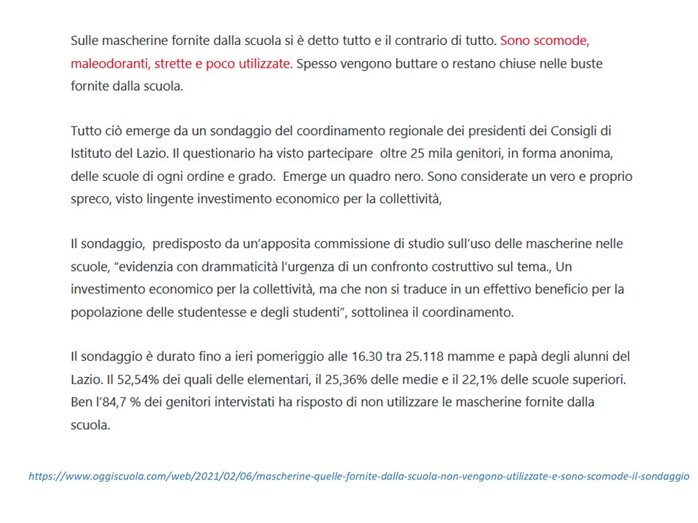 https://www.tecnicadellascuola.it/mascherine-a-scuola-a-settembre-agli-alunni-ancora-i-pannolini-di-arcuri-le-ffp2-bocciate-dal-cts/amp https://www.oggiscuola.com/web/2021/02/06/mascherine-quelle-fornite-dalla-scuola-non-vengono-utilizzate-e-sono-scomode-il-sondaggio https://www.fanpage.it/roma/le-mascherine-fornite-nelle-scuole-sono-scomode-e-maleodoranti-non-le-usa-l84-dei-genitori/ https://www.tecnicadellascuola.it/arcuri-indagato-per-le-mascherine/amp