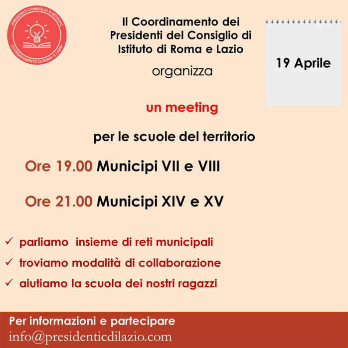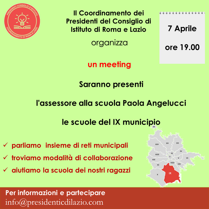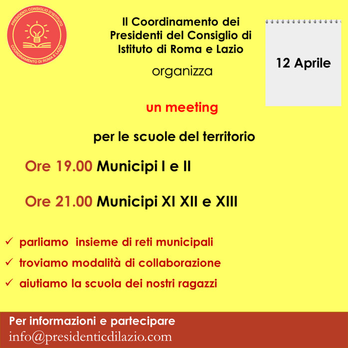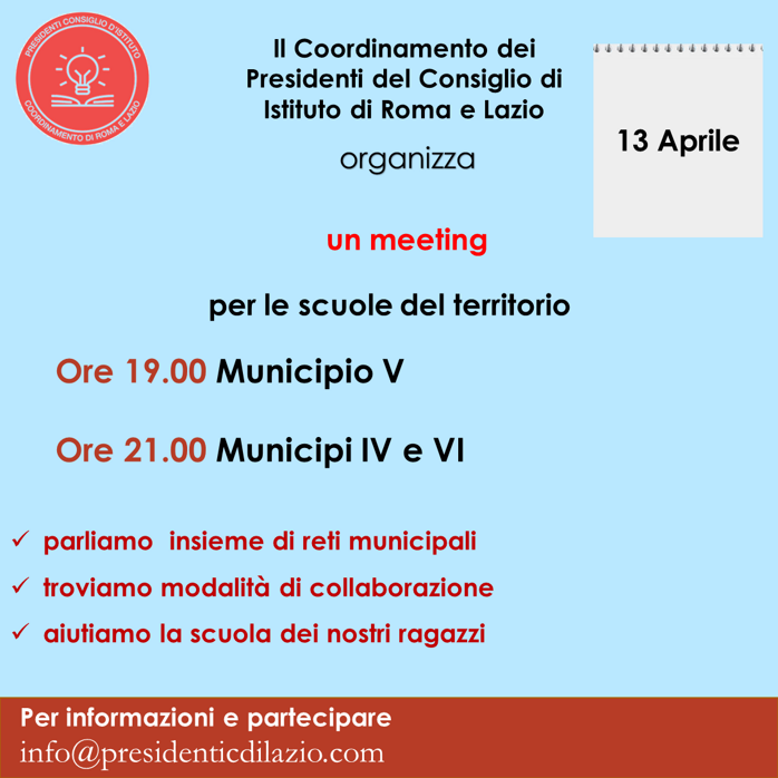MUNICIPIO REFERENTE SCUOLA MAIL                                I EMILIA GROSSI LICEO TASSO  emiliagrossi@tim.it  III TIZIANA CAGNAZZO I.C. CARLO LEVI  tiziana9474@gmail.com  VII EMANUELA ERSOCH I.C. GINO STRADA  emanuelaersoch@icloud.com  VIII KATYUSCIA LUPARELLO I.C. MONTEZEMOLO  katyaluparello76@gmail.com  X ANNA RIPULLONE I.C. CAROTENUTO  anna.ripullone@posteitaliane.it  XI LUISA VOLPICELLI IIS PAPARESCHI  luisa.volpicelli1968@gmail.com  XIV FRANCESCA CARFI' I.C. PABLO NERUDA  francesca.carfi@gmail.com  TUTTI GLI ALTRI MUNICIPI MASSIMO LAPETINA I.C. ALCIDE DE GASPERI  massimo.lapetina@gmail.com